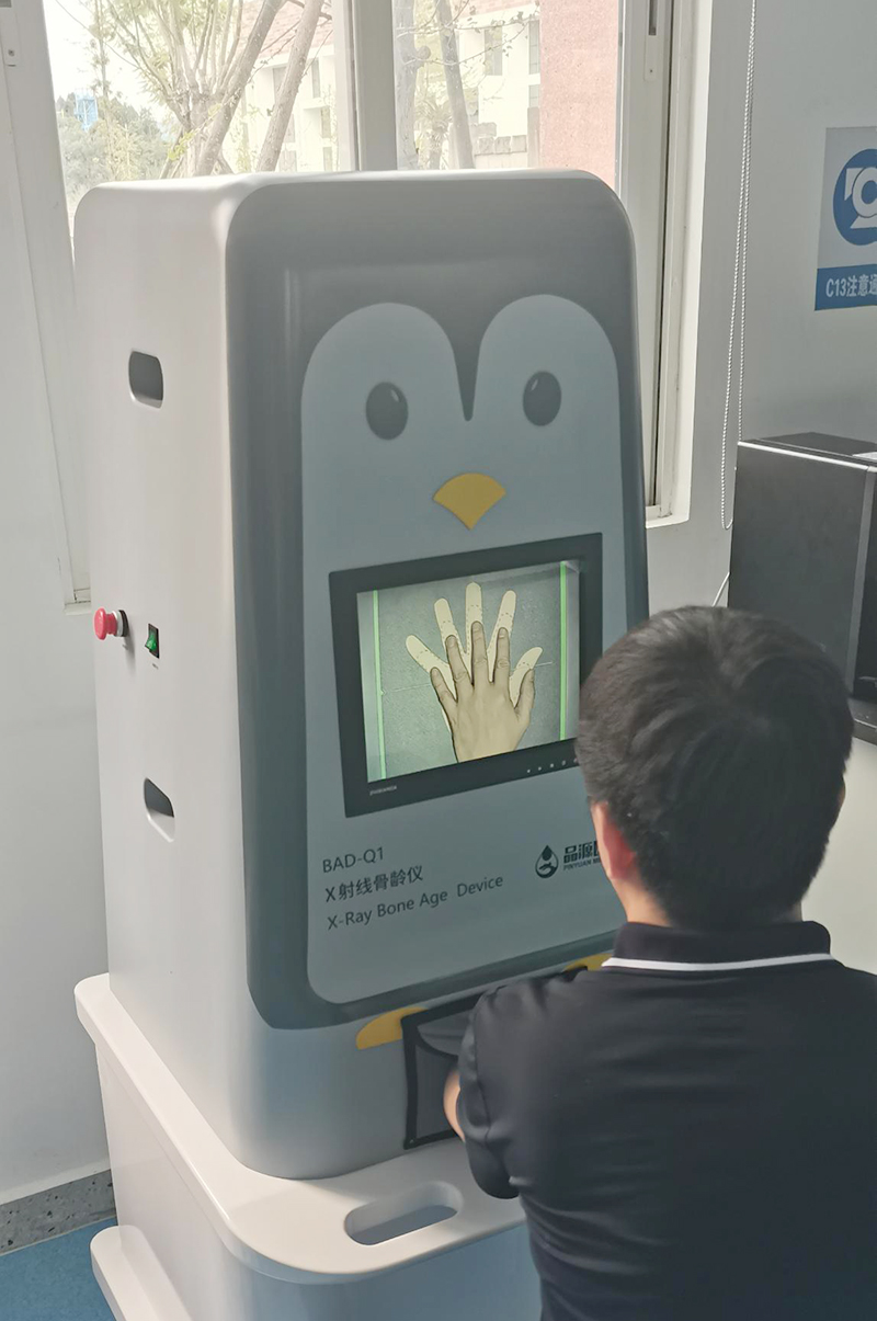 品源醫(yī)療X射線骨齡儀的便捷操作體驗也為日常使用帶來便利。配備的手部限位圖、監(jiān)控屏監(jiān)控擺位以及軟件視頻監(jiān)控功能組成的三方位定位系統(tǒng),能幫助操作人員快速、準確地定位檢測區(qū)域,減少重復(fù)拍攝,提升檢測效率。雙監(jiān)控顯示窗口的設(shè)計,使操作人員與被檢者可同步觀察擺位情況,增強檢測過程的透明度與互動性。此外,BAD-Q1采用企鵝造型的卡通化外觀設(shè)計,色彩柔和,兒科專用參數(shù)設(shè)置避免過度曝光,充分考慮受檢人群心理與生理特點,緩解在檢測時的緊張情緒,保障檢測的安全性與舒適性。