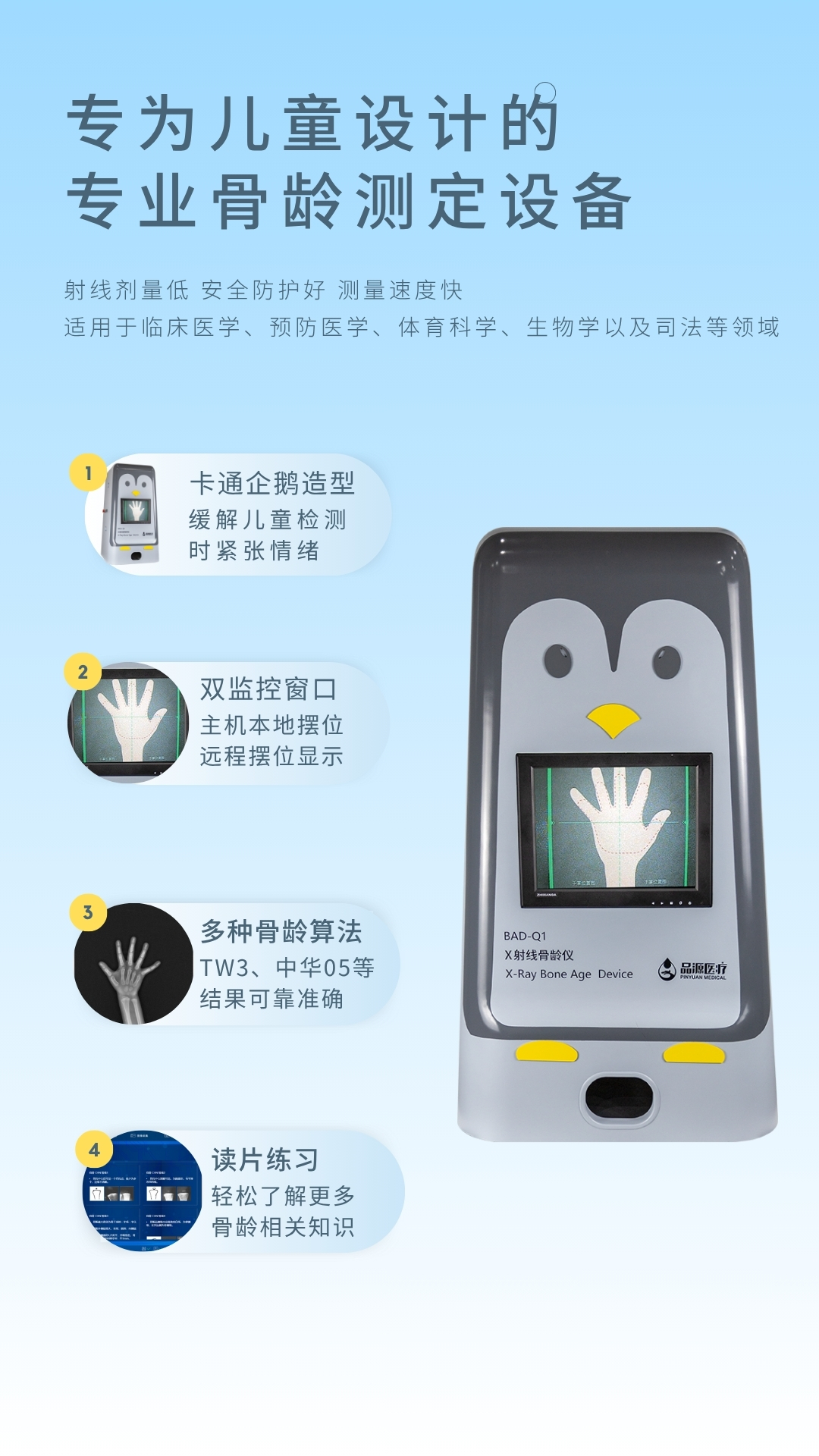 BAD-Q1型X射線骨齡儀產(chǎn)品適用兒童醫(yī)院、婦幼保健院、各級醫(yī)院的兒保科,體育研究機構(gòu),體育學(xué)校等,用于對青少年骨齡檢測與體格發(fā)育評價。