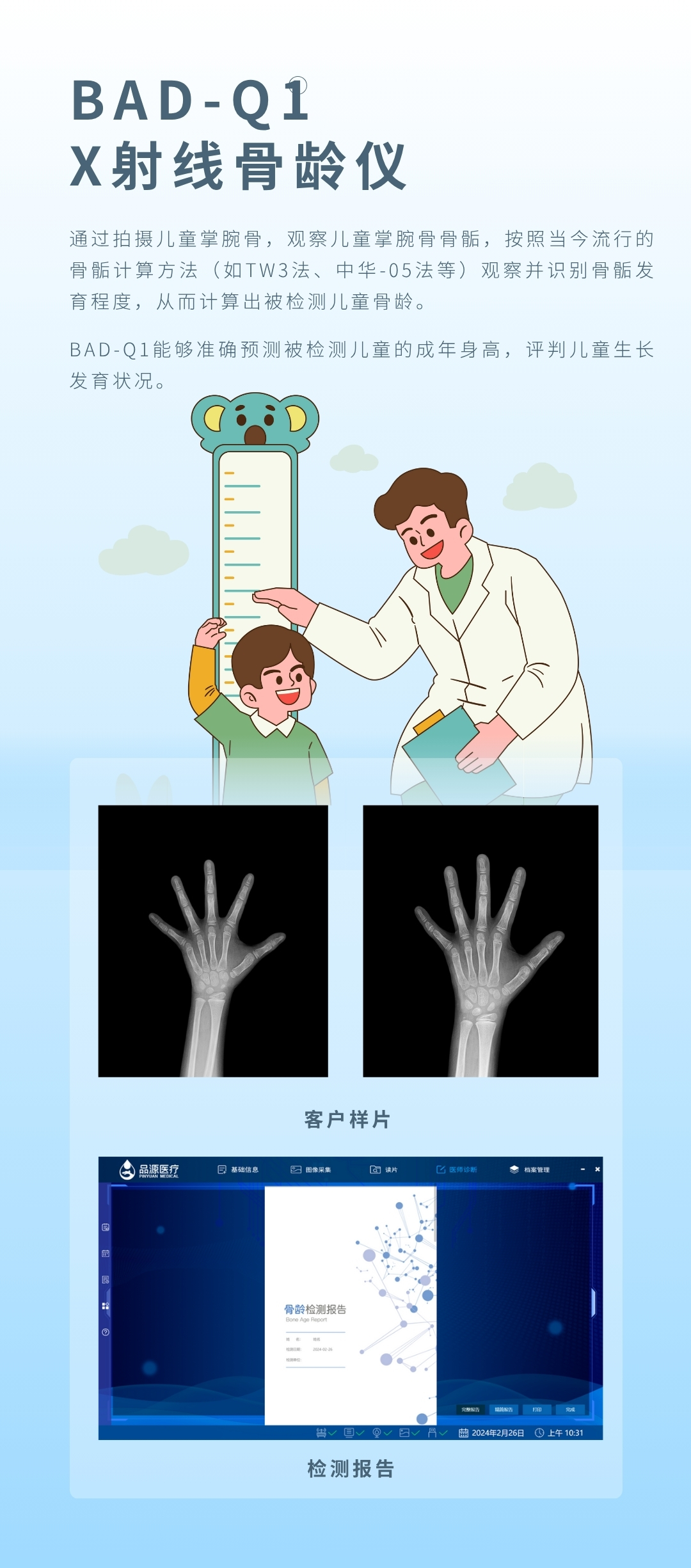 產(chǎn)品適用兒童醫(yī)院、婦幼保健院、各級醫(yī)院的兒???,體育研究機構(gòu),體育學(xué)校等,用于對青少年骨齡檢測與體格發(fā)育評價。