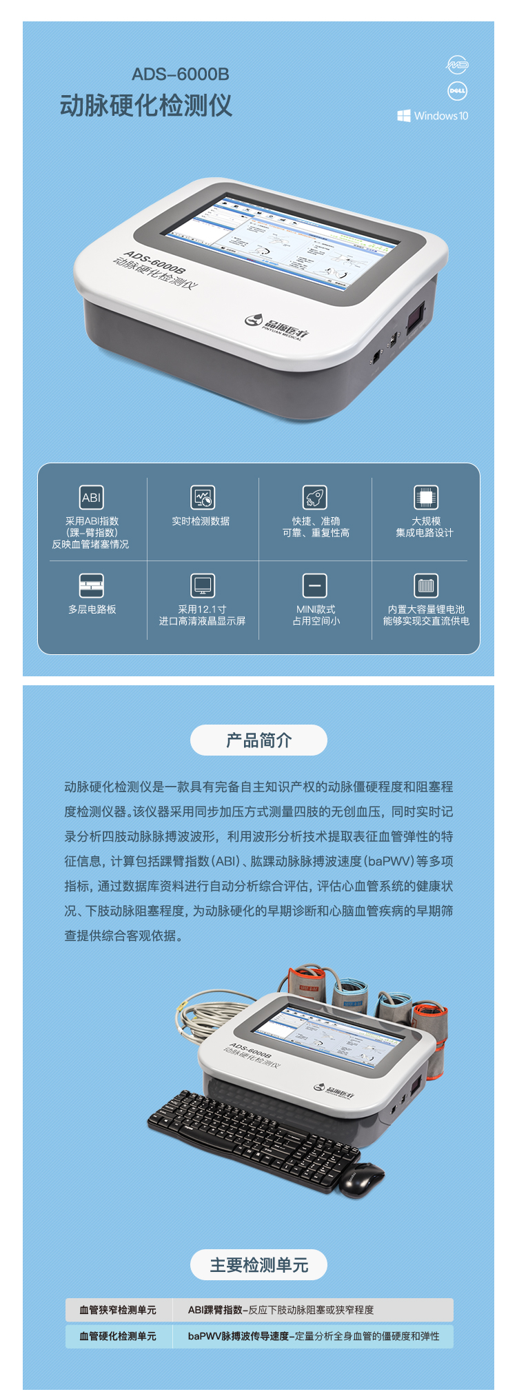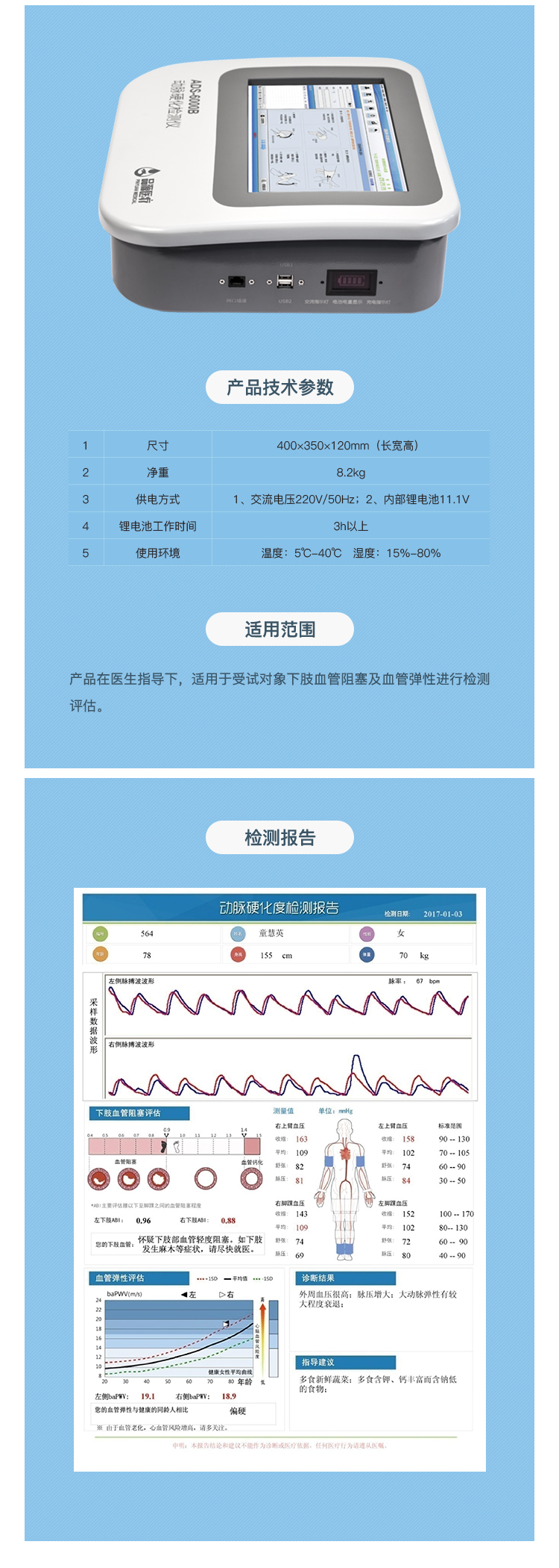 適用范圍:產(chǎn)品在醫(yī)生指導(dǎo)下,適用于受試對(duì)象下肢血管阻塞及血管彈性進(jìn)行檢測(cè)評(píng)估。